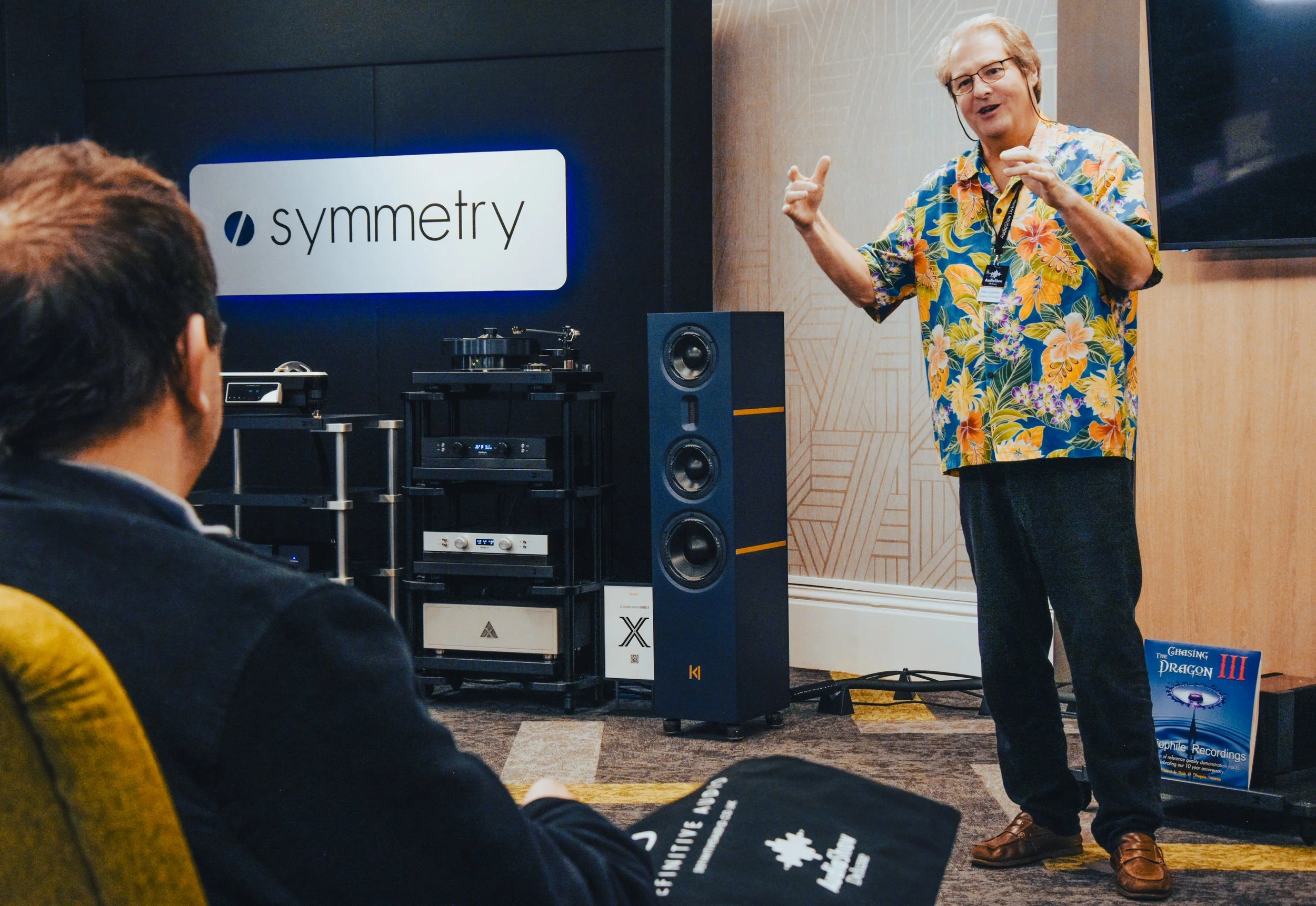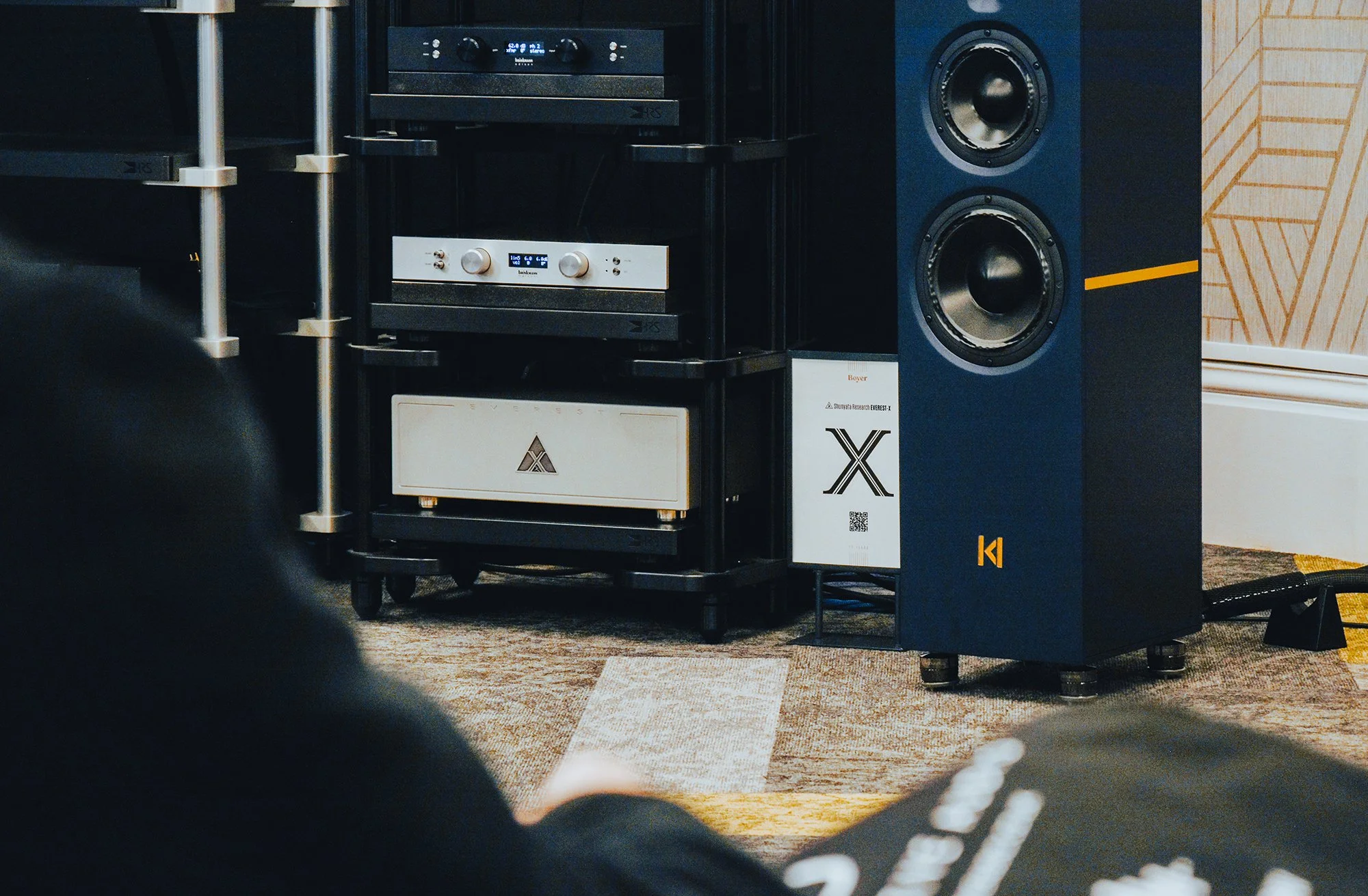 Our friends at Symmetry Systems gave visitors a chance to hear even more Shunyata Research and Kroma Atelier. They were using the new EVEREST-X shelf model, full Shunyata cabling, and Kroma’s Jovita speakers. It was great to see the same team still going strong: Mike Valentine of Chasing The Dragon Audiophile Recordings, Matthias Lück of Brinkmann Audio, Jason Ford, and the absolutely incredible Reema, who seems to be getting better and better year by year, nearly bringing the room to tears with a moving performance.
